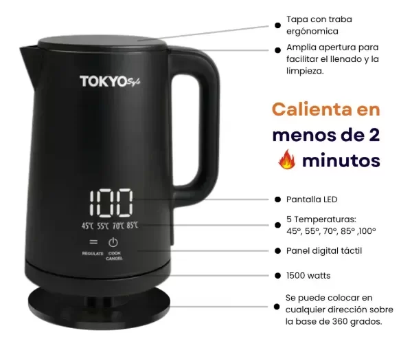 La Tokyo Style Digital combina diseño moderno, materiales de alta calidad y tecnología inteligente para que tu mate, té o café estén listos en minutos.